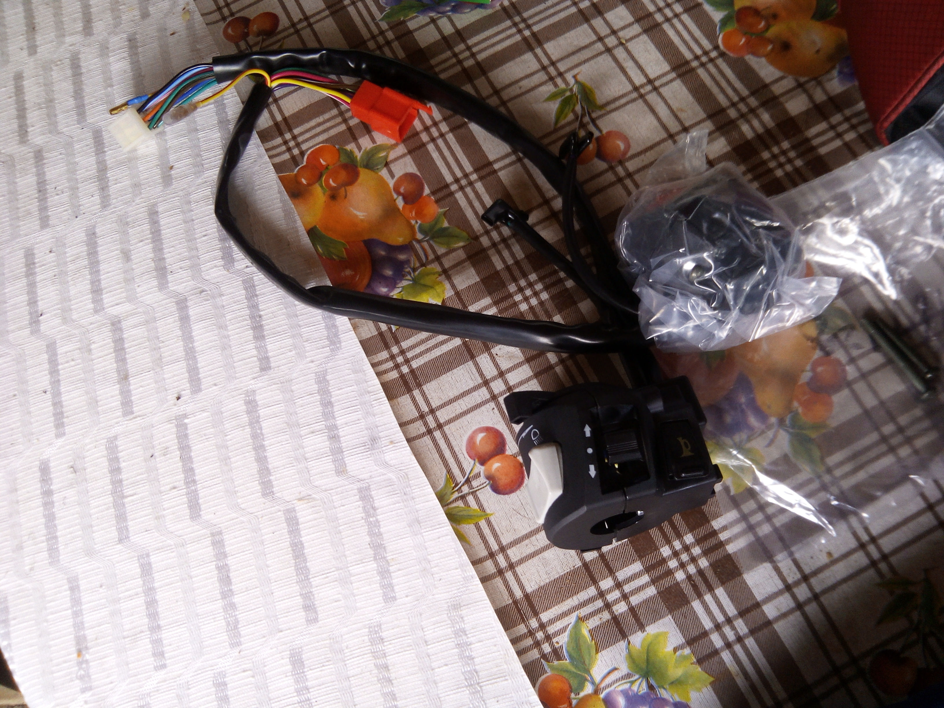 Lewy przycisk jest niemal identyczny. Różni go tylko kolor włącznika świateł drogowych oraz dodatkowa manetka ssania, którą możemy bez problemu zdemontować.