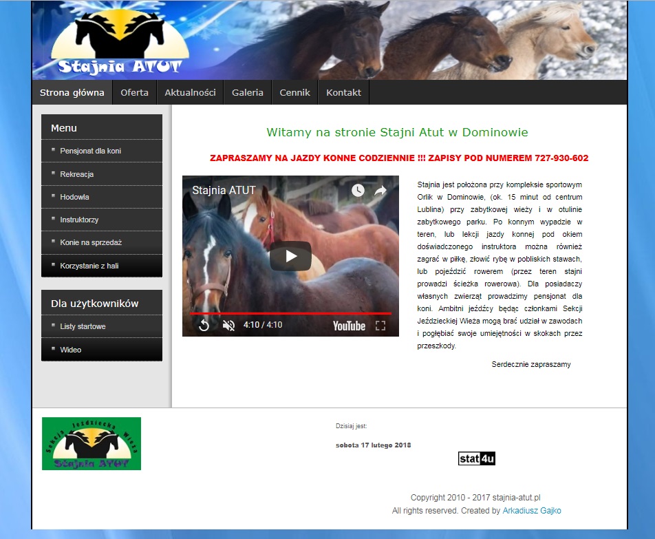 Pierwsze moje dzieło opracowałem dla Stajni Atut. Prace nad stroną rozpocząłem w wieku 12 lat. Obecnie strona wykorzystuje system cms - Joomla, wcześniej HTML oraz PHP. |